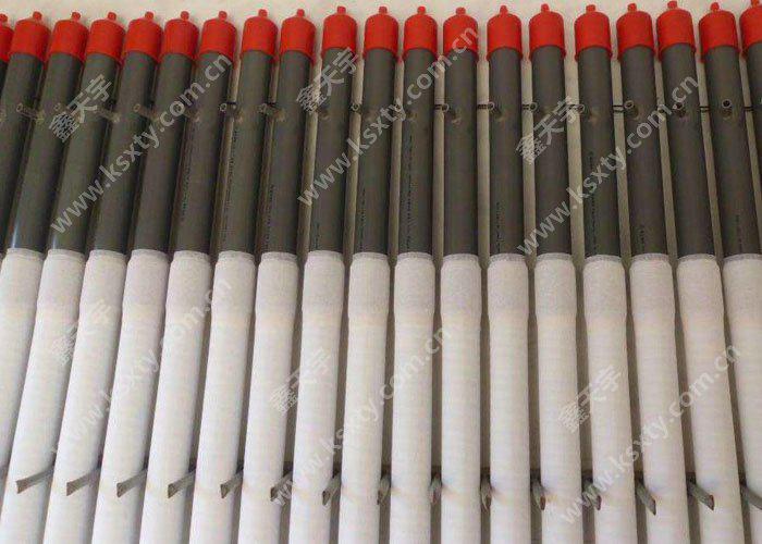 電泳陽極管(TAS):又名電泳陽極罩 、管式陽極 。一般采用PVC和ABS管兩種材質做內支撐,在支撐管壁上裹上一層電泳涂裝專用離子陽極膜或陰極膜,達到離子交換、去除酸根離子,達到穩定槽液ph值等作用。陽極為圓柱體結構,稱為陽極管,電極直徑為Φ48mm或51mm,推薦304或316的不銹鋼管厚度不低于3mm,陽極膜外徑Φ 75mm, 根據槽體的深度不同,提供不同長度的陽極管。